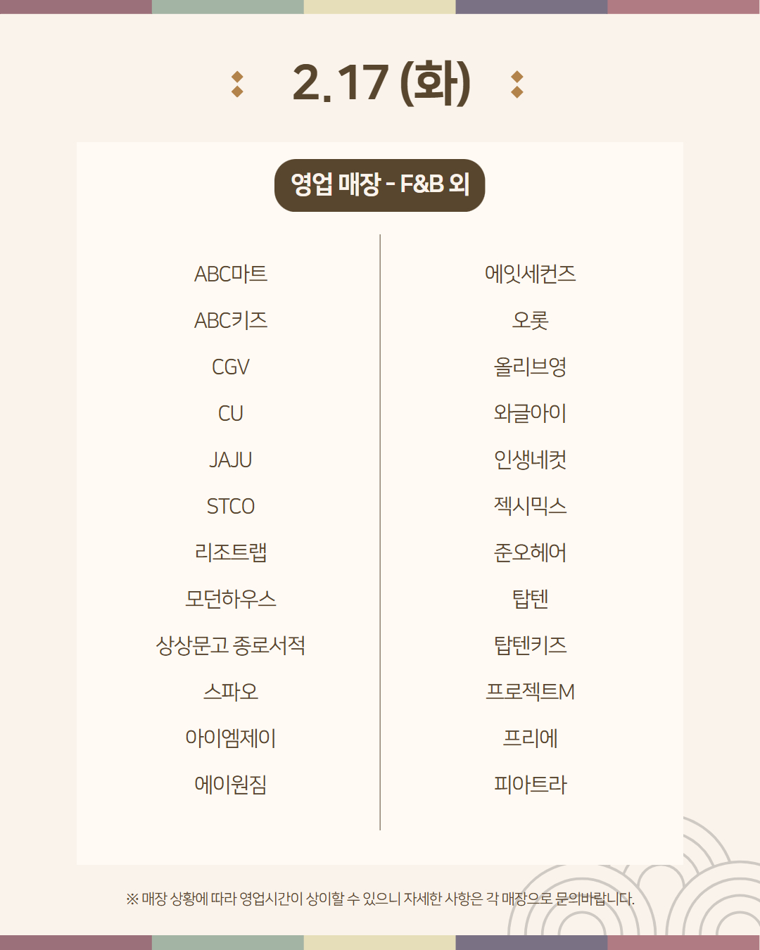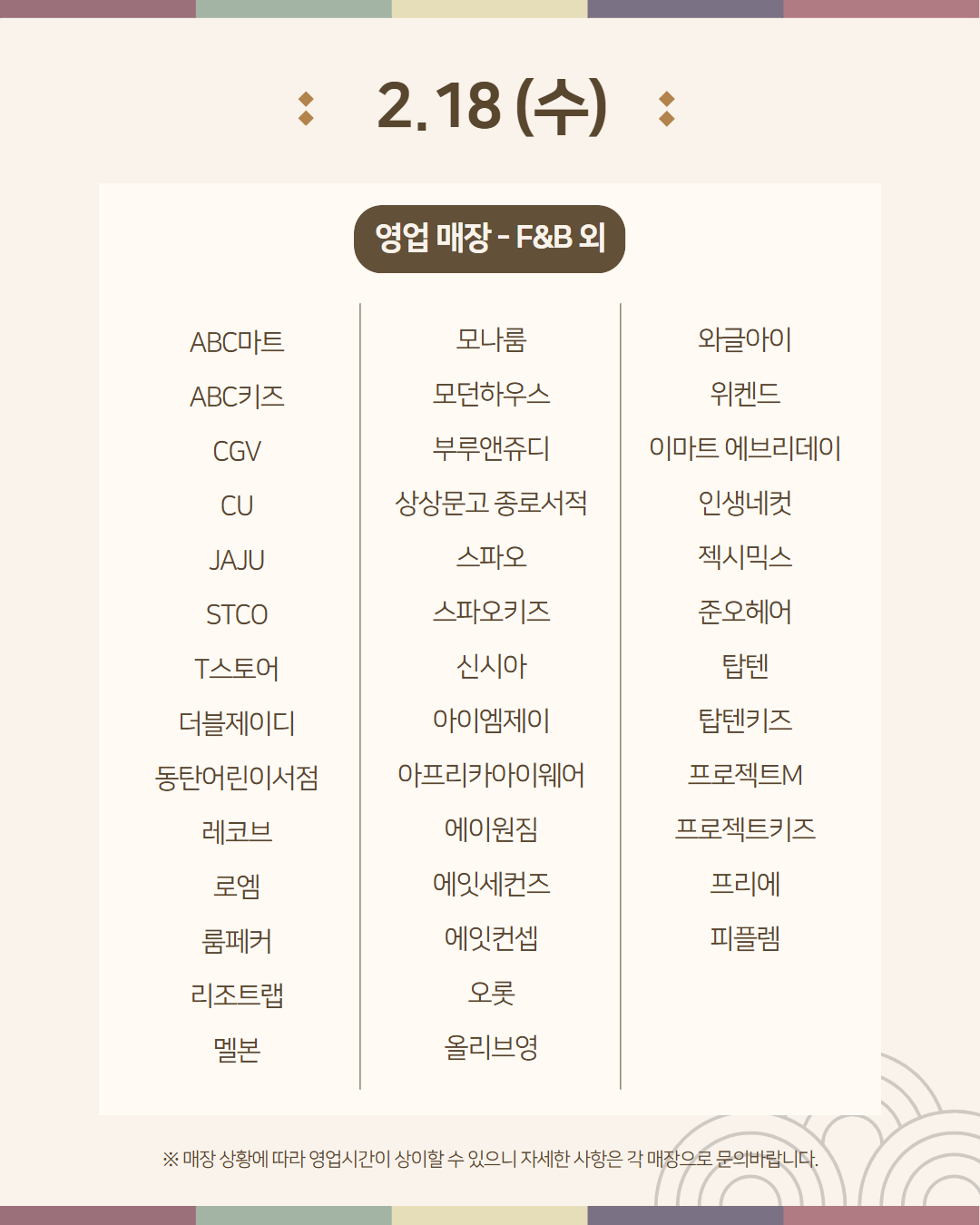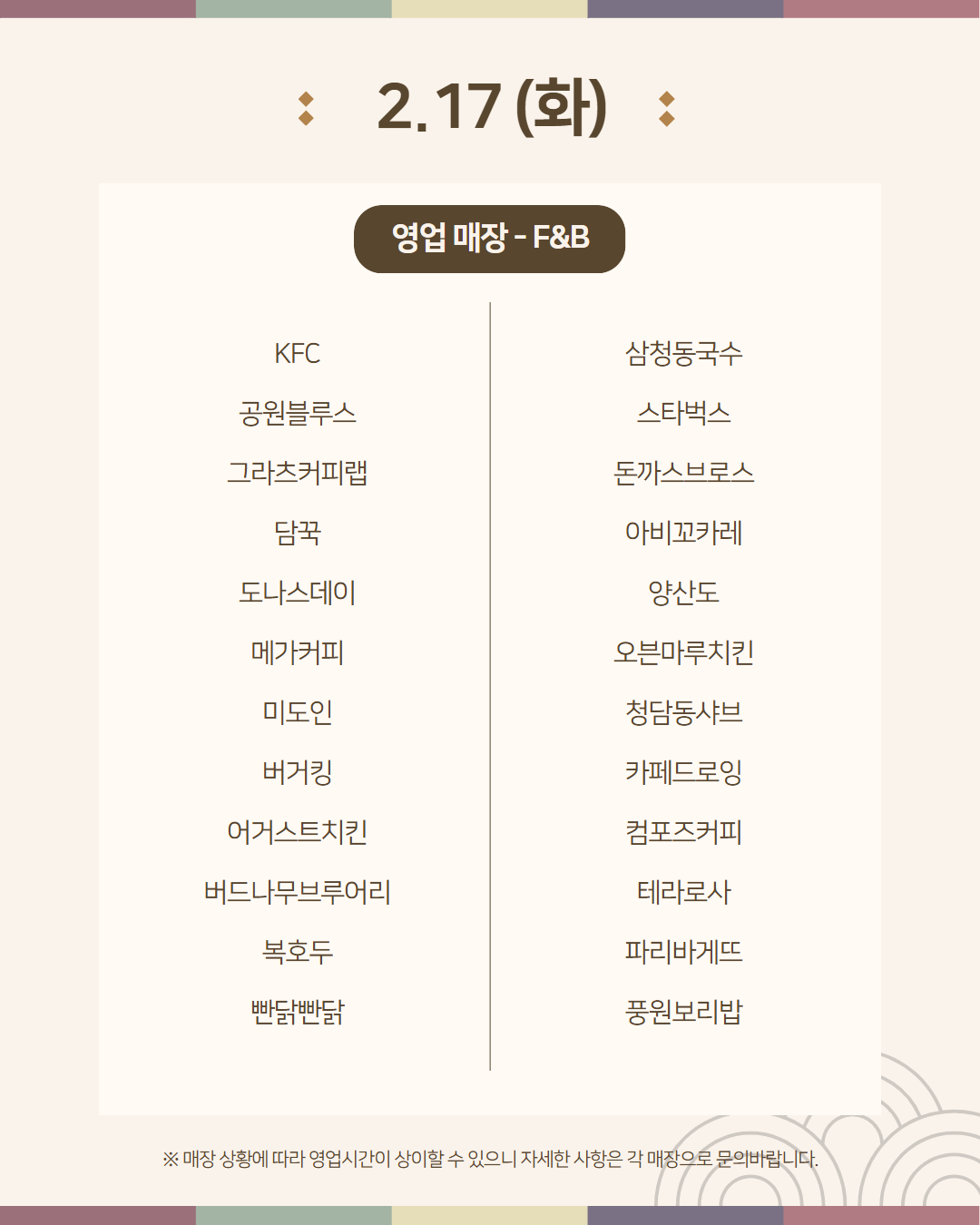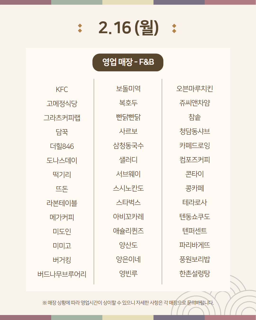 설 연휴 기간 자세한 영업시간은 각 매장으로 문의하여 주시기 바랍니다.