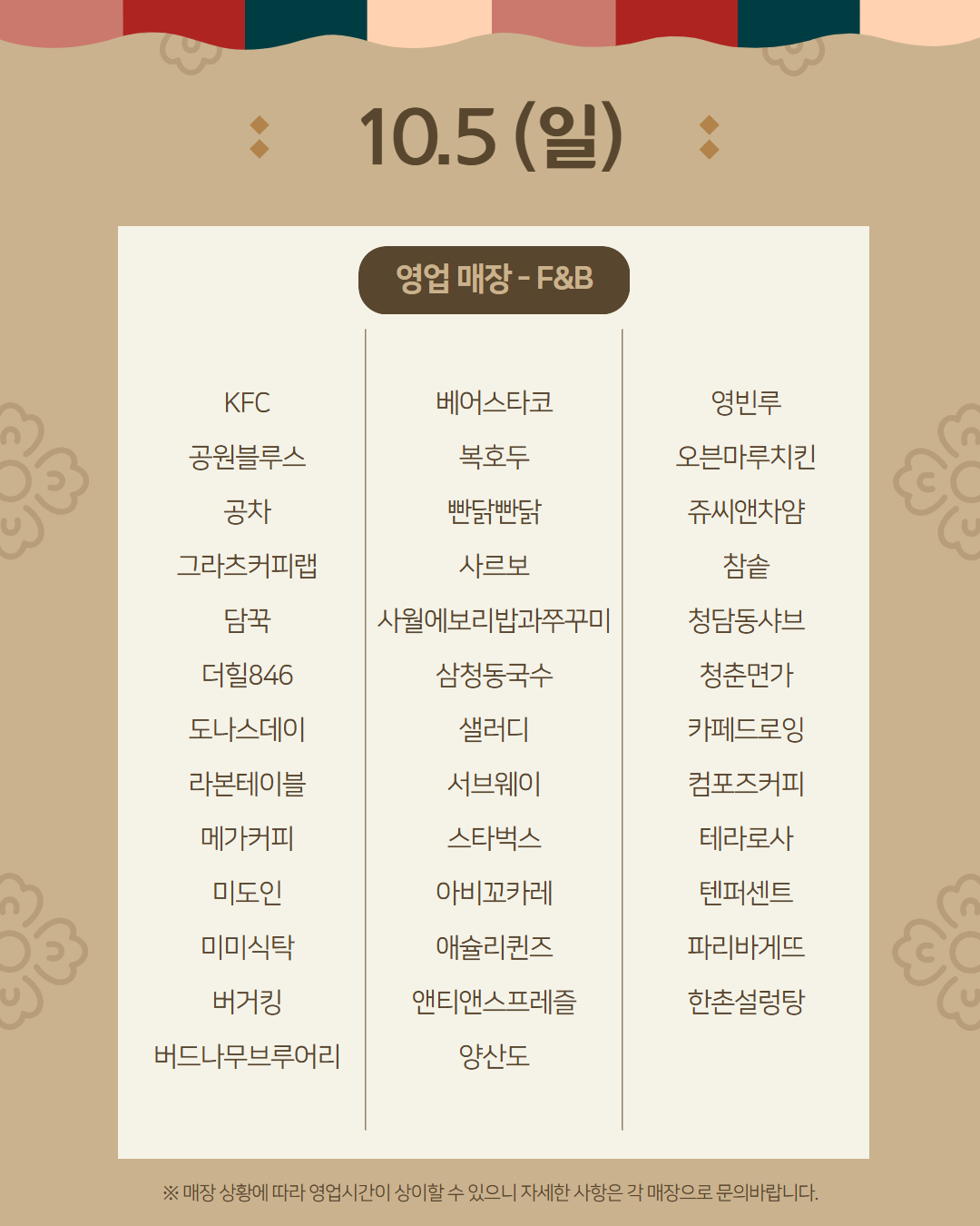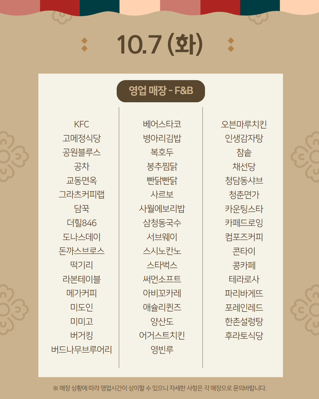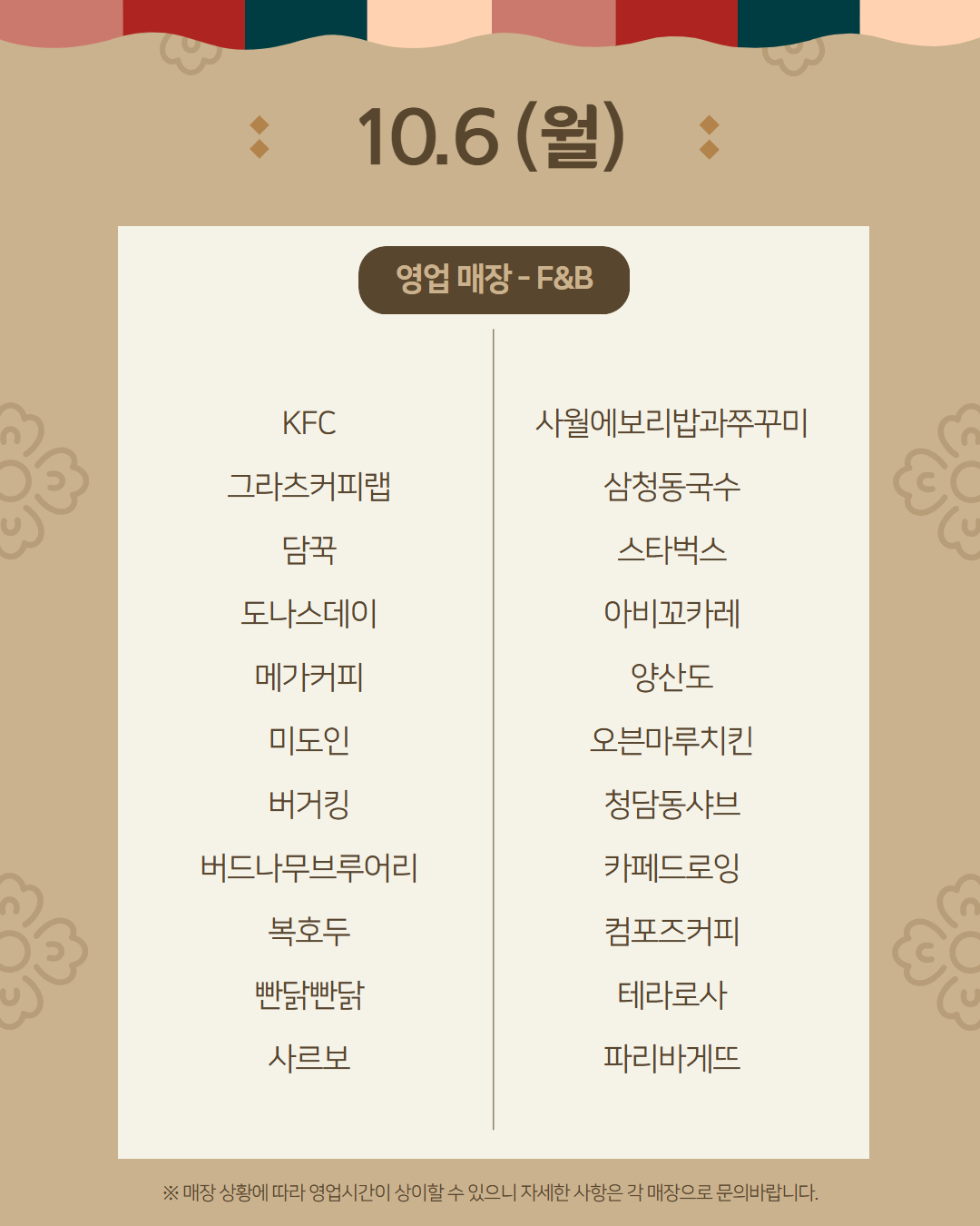 추석 연휴 기간 자세한 영업시간은 각 매장으로 문의하여 주시기 바랍니다.
