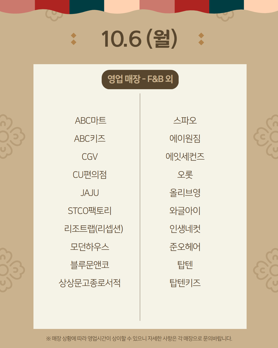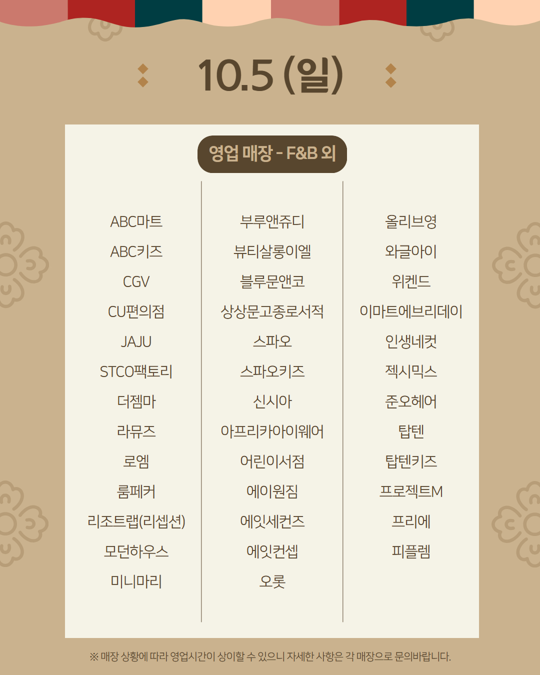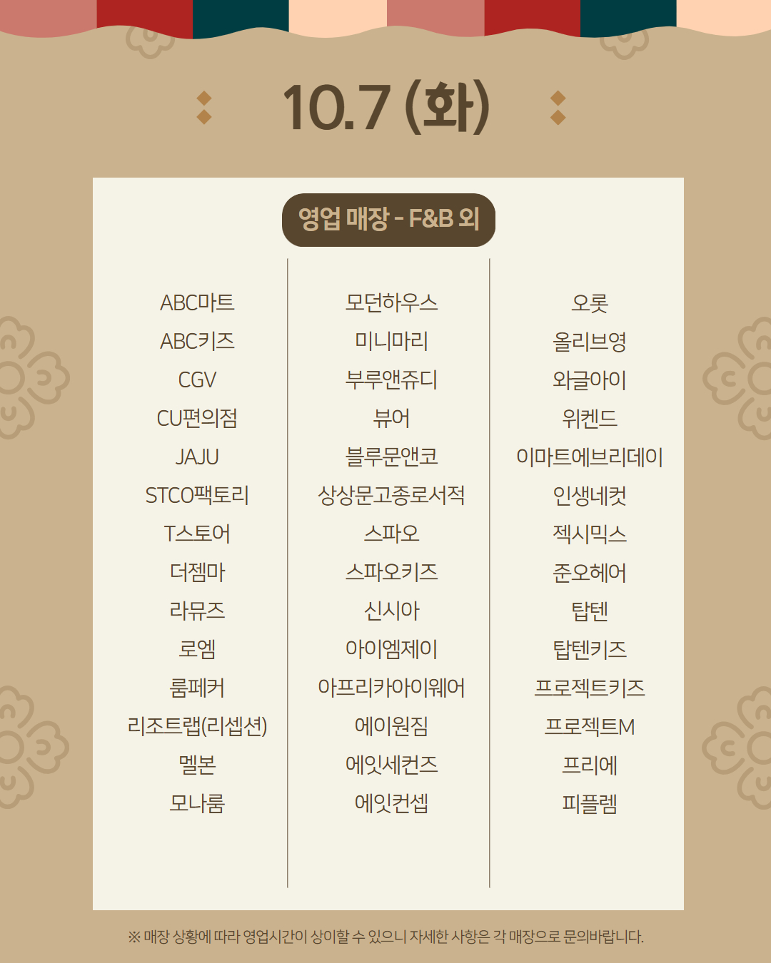추석 연휴 기간 자세한 영업시간은 각 매장으로 문의하여 주시기 바랍니다.